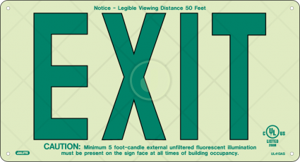 UL413 UL924 Listed Photoluminescent EXIT Sign, Green Letters